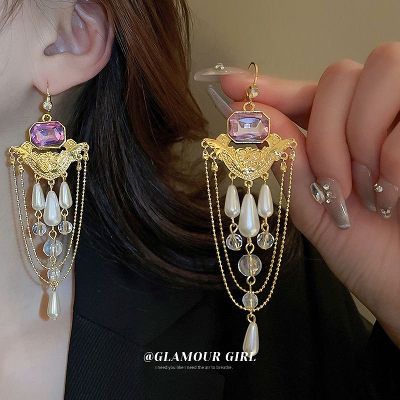 Diamond-encrusted pearl crystal tassel French retro earrings quantity