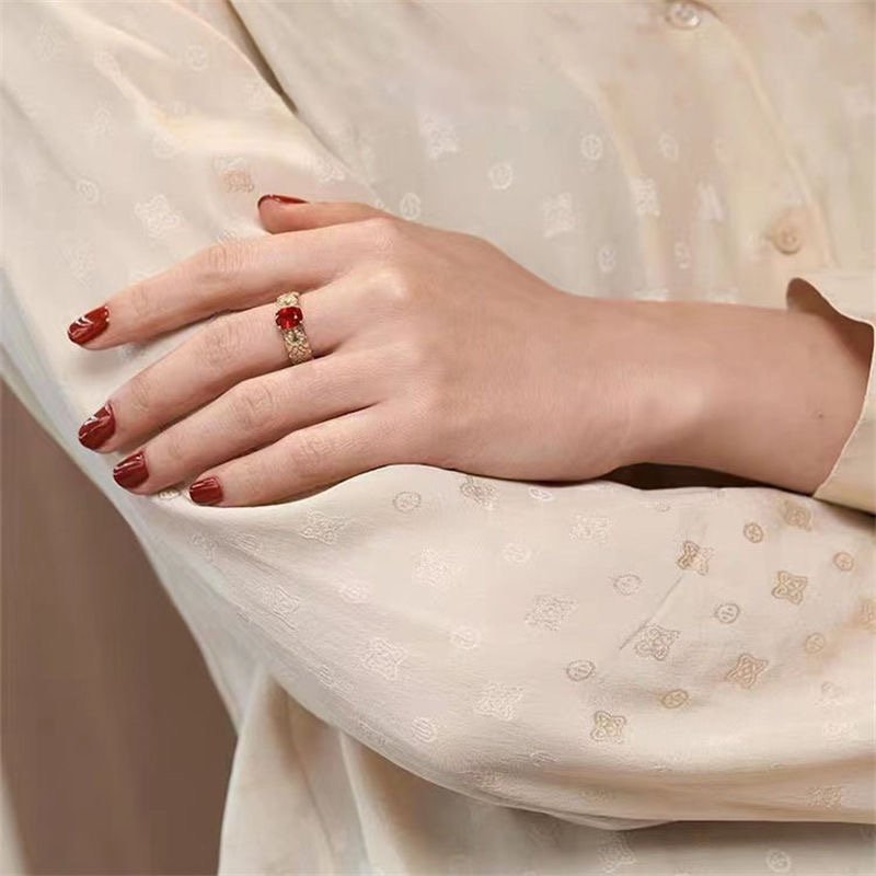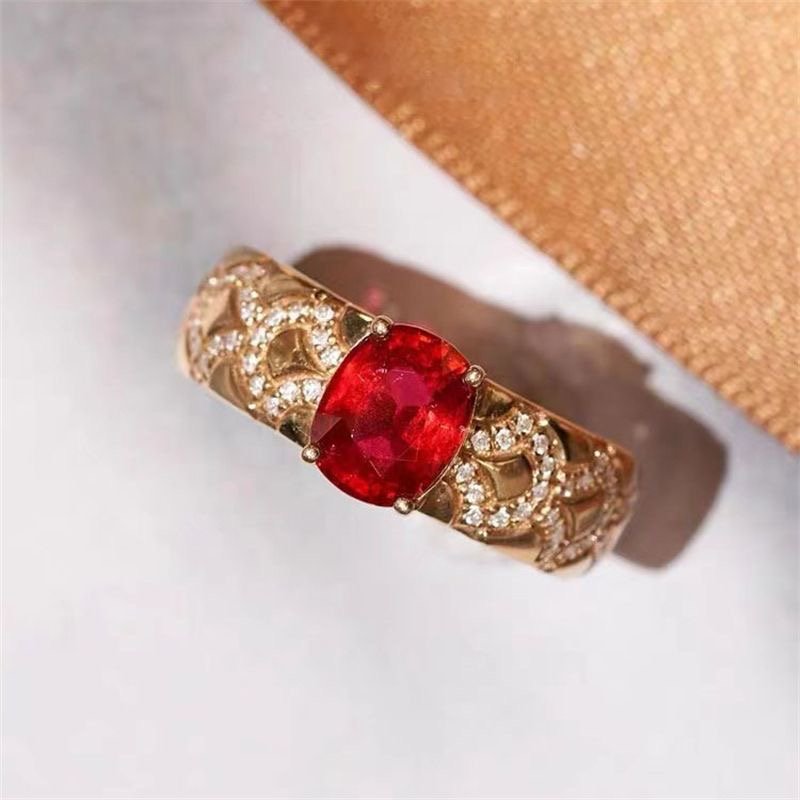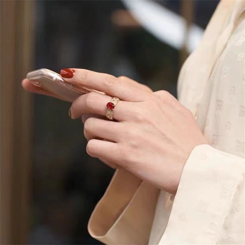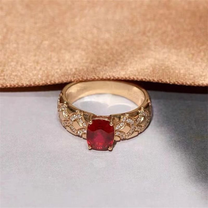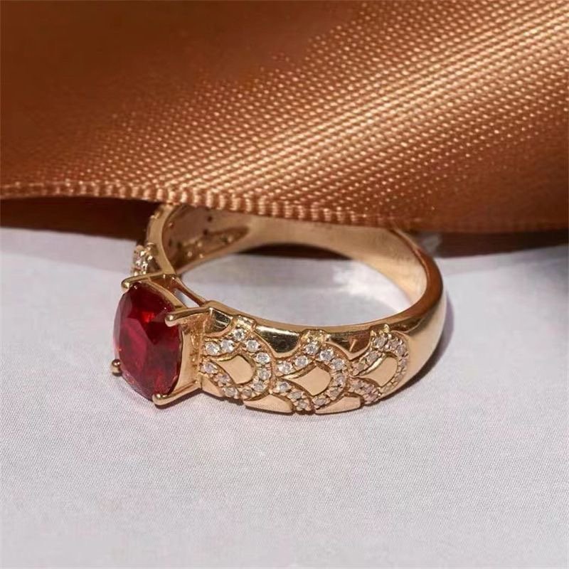 Carved gold openwork lace double-color gold diamond red corundum colorful ring
